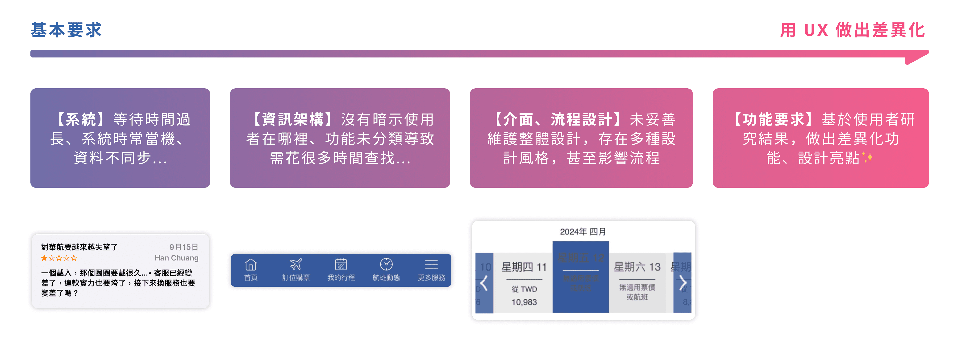 蒐集 App Store、Google Play 及社群上對華航 App 的評論後,將目前的問題分成系統、資訊架構、介面及流程設計,並且希望可以基於使用者研究結果,做出差異化功能、設計亮點