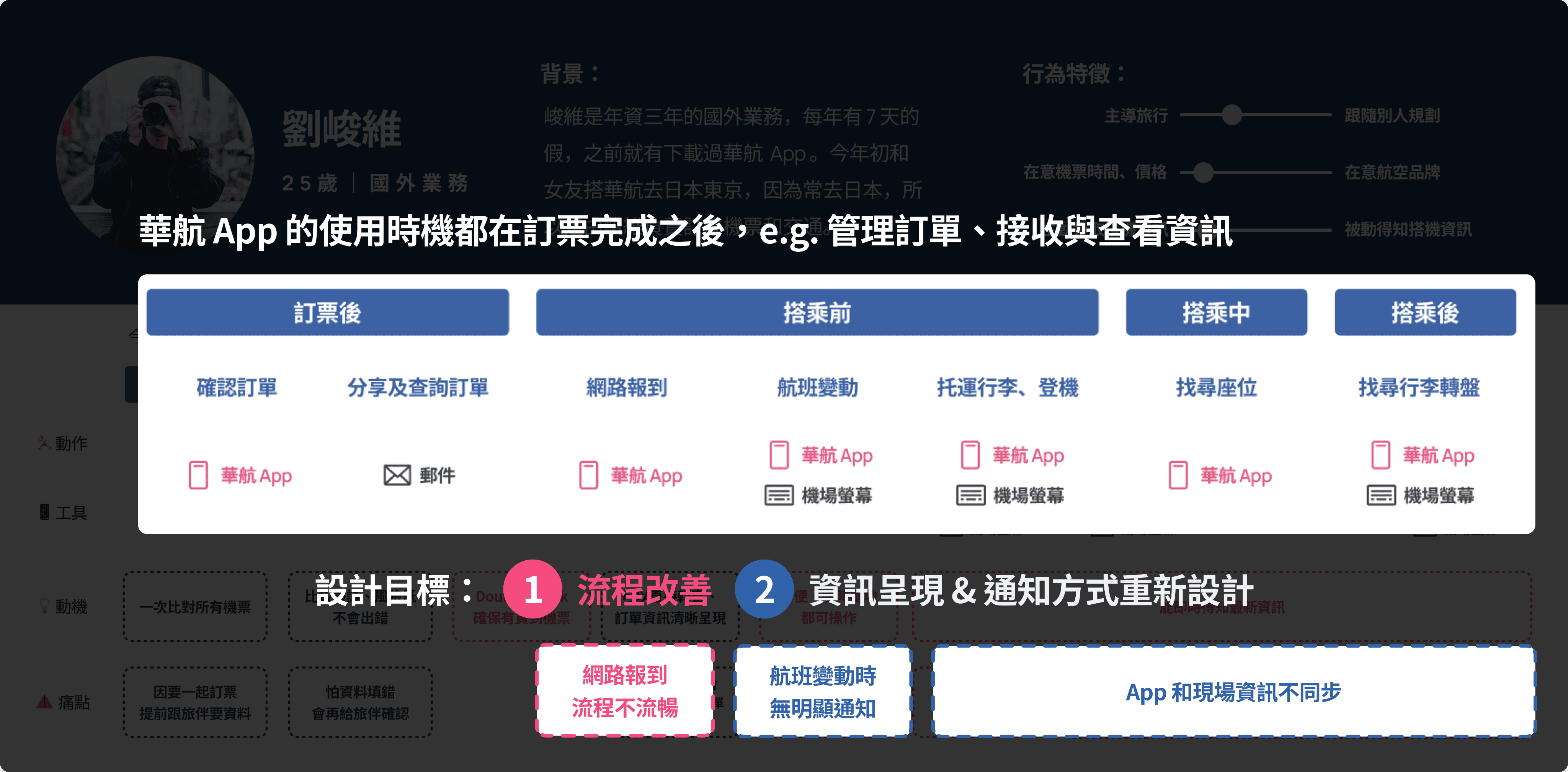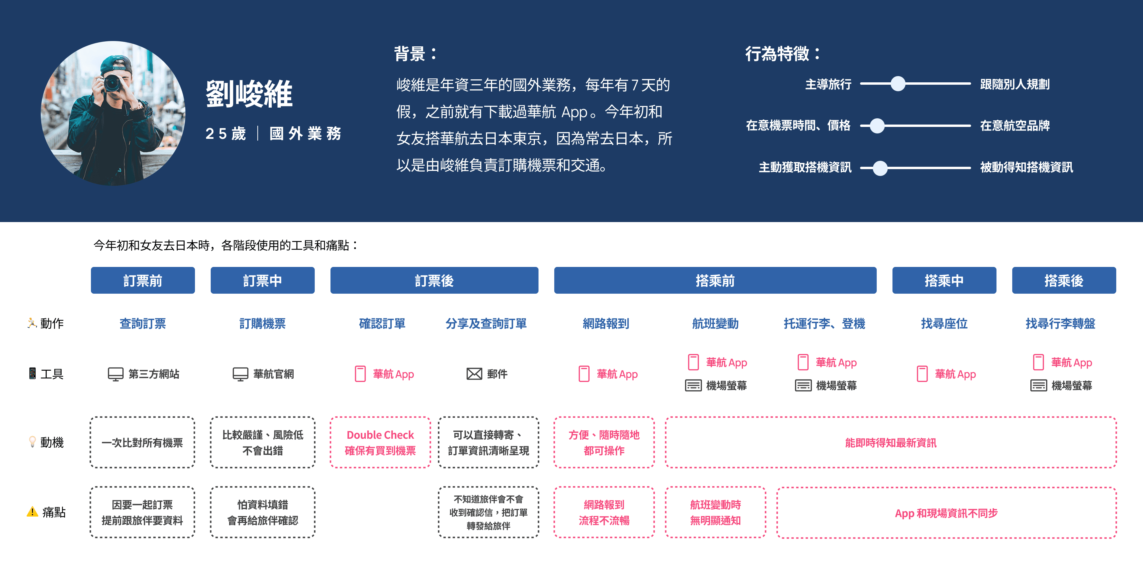 因此,在後續設計中,我們將 App 的核心目標使用者收斂至「訂票者」,並建立 Persona「劉峻維」,以具體描述目標使用者的背景、行為特徵與需求。同時,我們也透過 User Journey Map 整理旅客從訂票到搭機的完整歷程,以釐清不同階段的使用情境、使用工具與主要痛點。