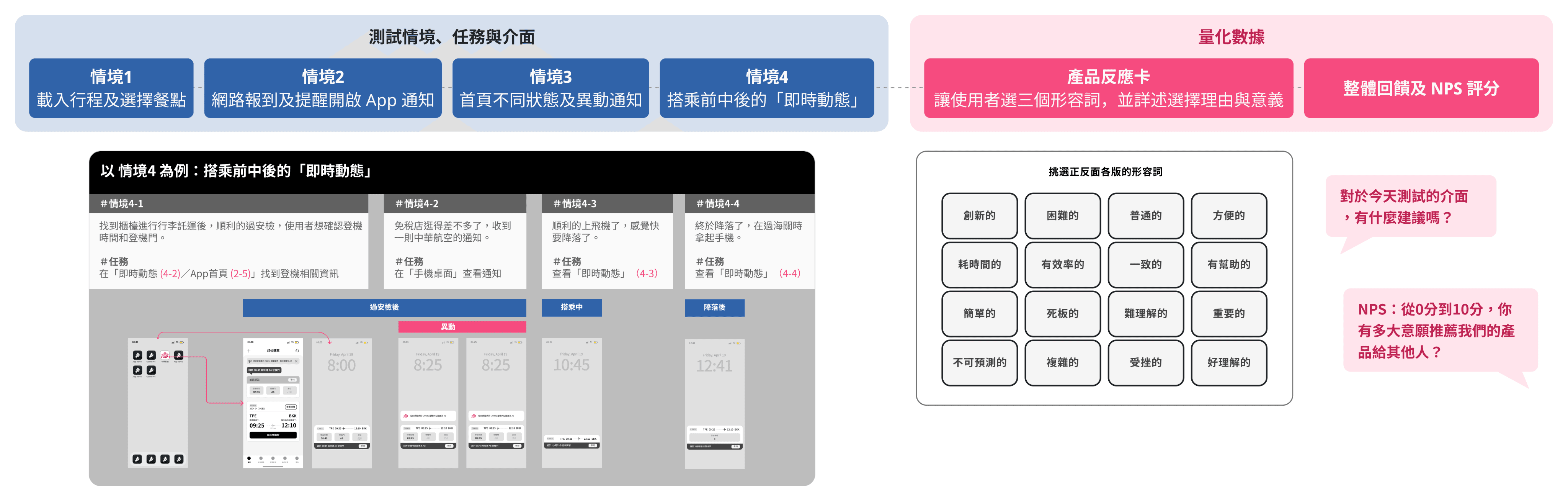 本次測試模擬使用者在實際旅程中可能遇到的情境,涵蓋四個關鍵使用情境,包含 (1) 行程載入及選擇餐點、(2) 網路報到及提醒開啟 App 通知、(3) 首頁不同狀態及異動通知,以及 (4) 搭乘前中後的即時動態,並請受測者完成對應任務,以觀察其操作行為與理解情況。