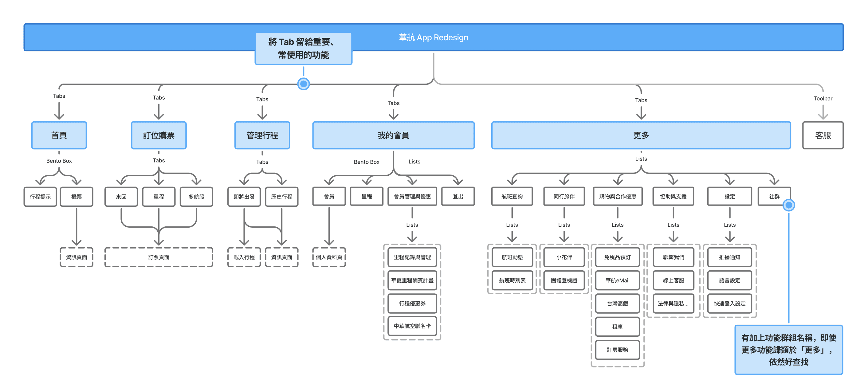 根據受訪者 卡片分類 結果,我們重新梳理了整體資訊架構,現在共有「首頁」、「訂位購票」、「管理行程」、「我的會員」、「更多」,共 5 個 Tab,以及常駐各個頁面的「客服」。並且現在會將功能分類並標註分類群組名稱,讓使用者更好查找。下方圖片為優化後的資訊架構:
