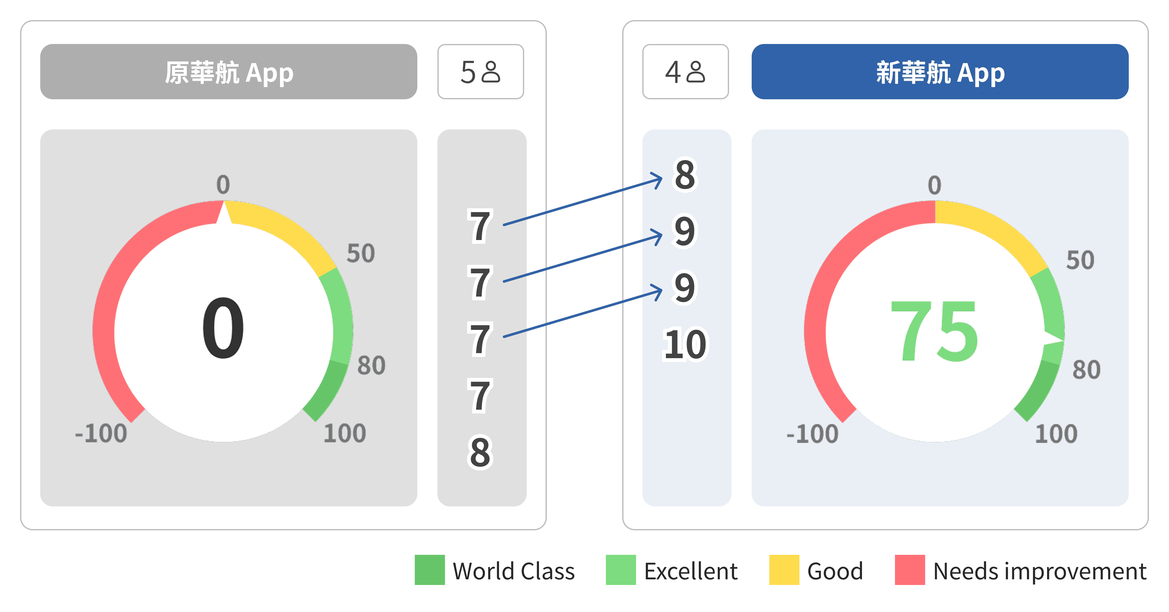 在 NPS 方面,本次共有 4 位受測者參與評分,其中 3 位曾於訪談階段評估過原版華航 App。透過前後比較,NPS 分數由原先的 0 (Need Improvement - Good) 提升至 75 (Excellent),顯示 redesign 在整體體驗上有明顯改善。