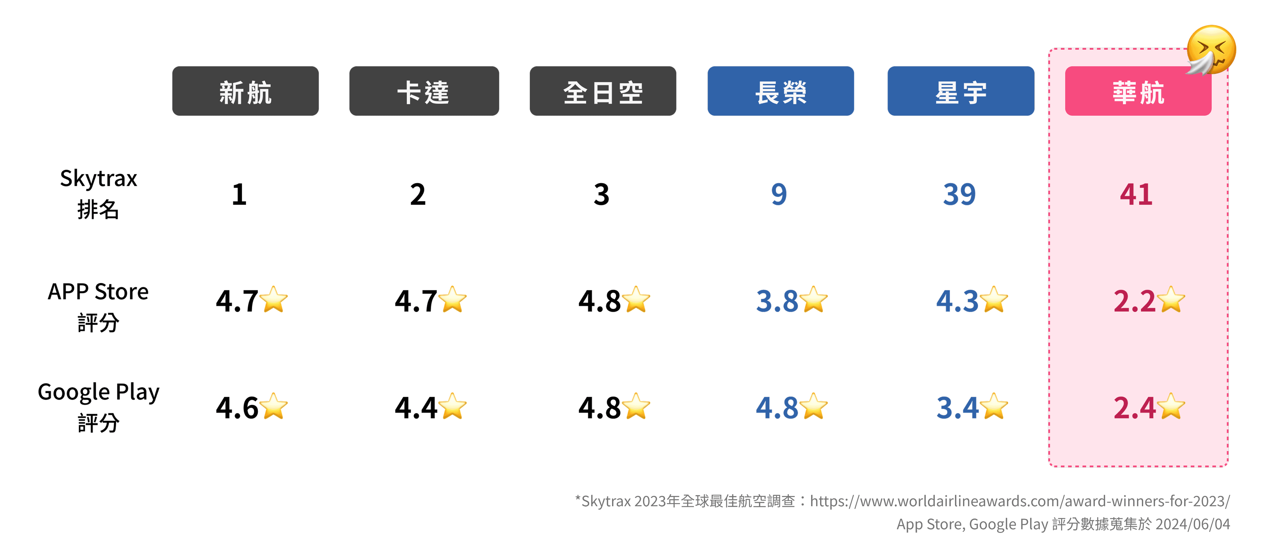 中華航空是台灣主要的國際航空公司之一,每年服務大量往返亞洲與全球的旅客。然而在 Skytrax 2023 全球最佳航空公司排名(評比項目包含數位體驗)以及 App 商店上的 評分表現卻都相對落後。