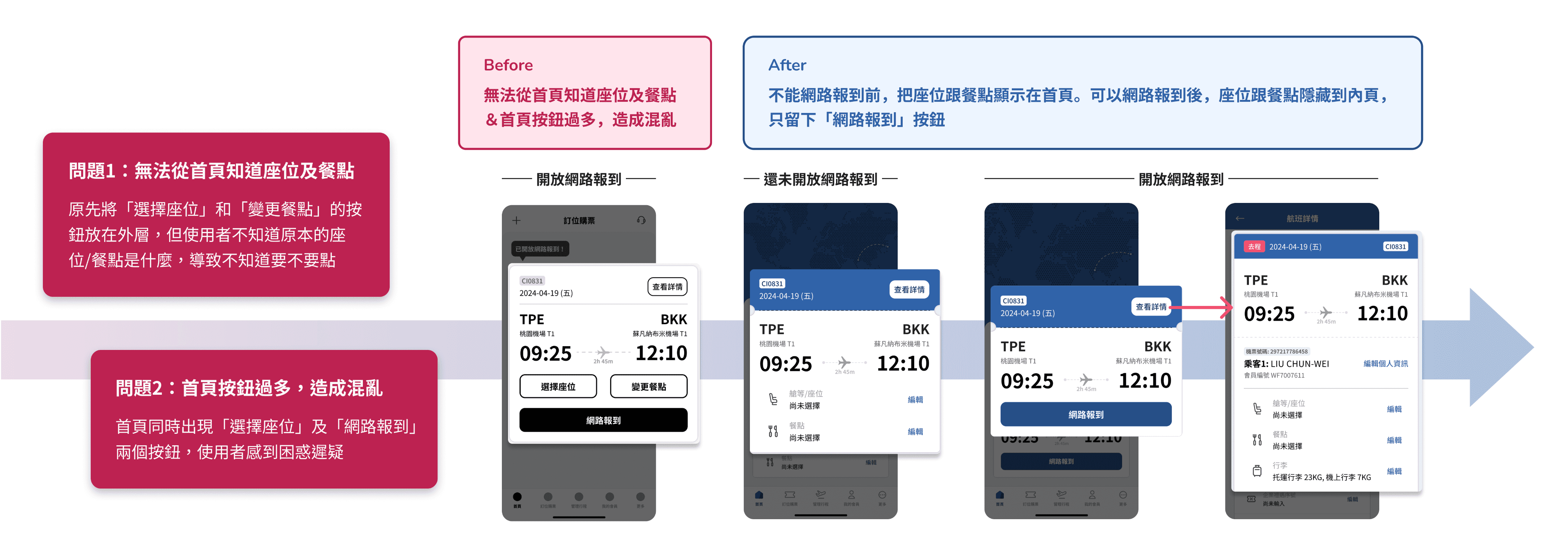 以使用者研究為基礎,重新設計 App 的報到流程與航班資訊呈現,讓旅客在出發前與旅途中能更快速掌握重要資訊。