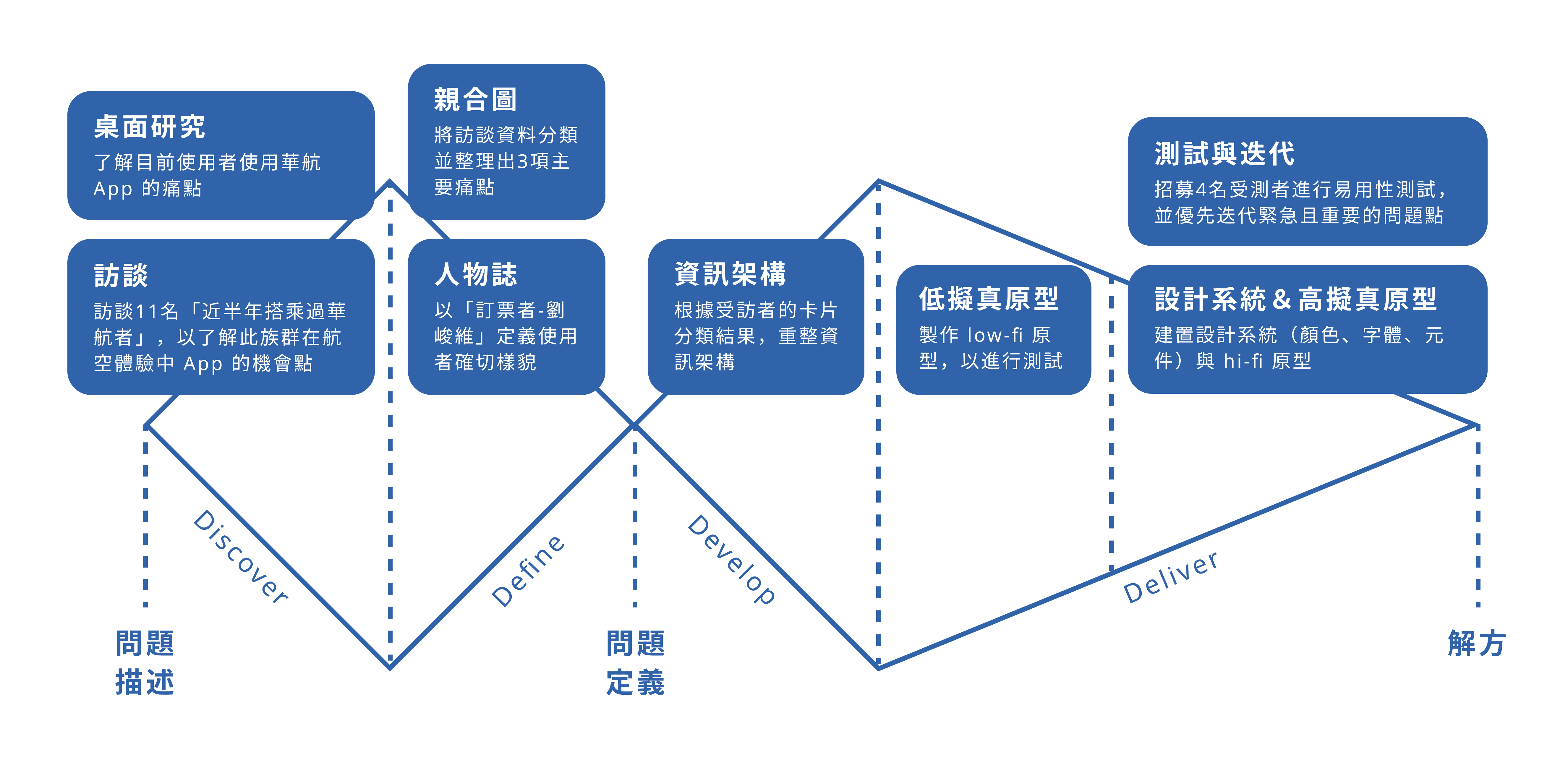 設計流程依循 Discover → Define → Design → Test 的設計流程,從桌面研究與使用者訪談(11位)開始,整理旅客在使用 App 管理行程時的主要困難,並透過設計與易用性測試逐步驗證與優化設計方向。
