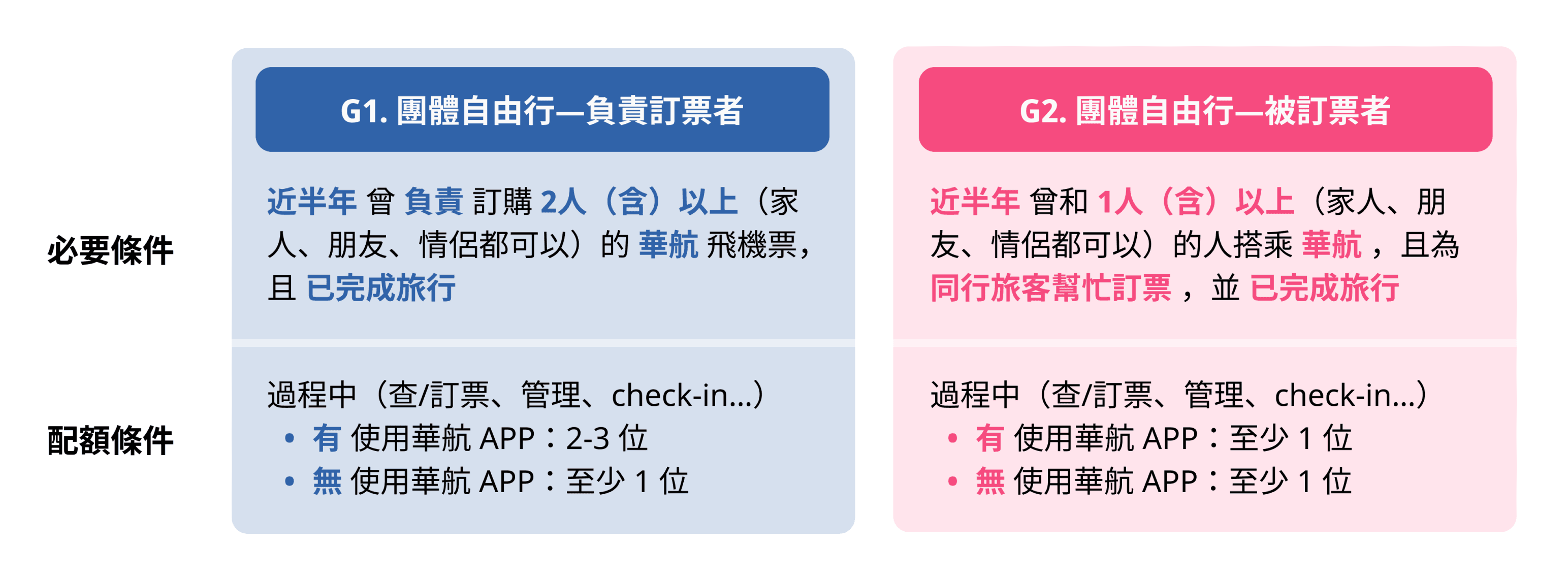 本次專案希望招募訂票者/被訂票者兩種角色,並且針對有沒有使用華航 App 有另外配額,但後來發現身為被訂票者,且有使用華航 App 的條件太難滿足,且整體受訪人數太少,收集到的反饋容易有偏差,因此又重新調整受訪條件和人數,並再進行一次招募。此次的經驗讓我學到 需要隨時依照招募狀況去調整受訪條件,不要執著於原先的規劃而耽誤研究時程。