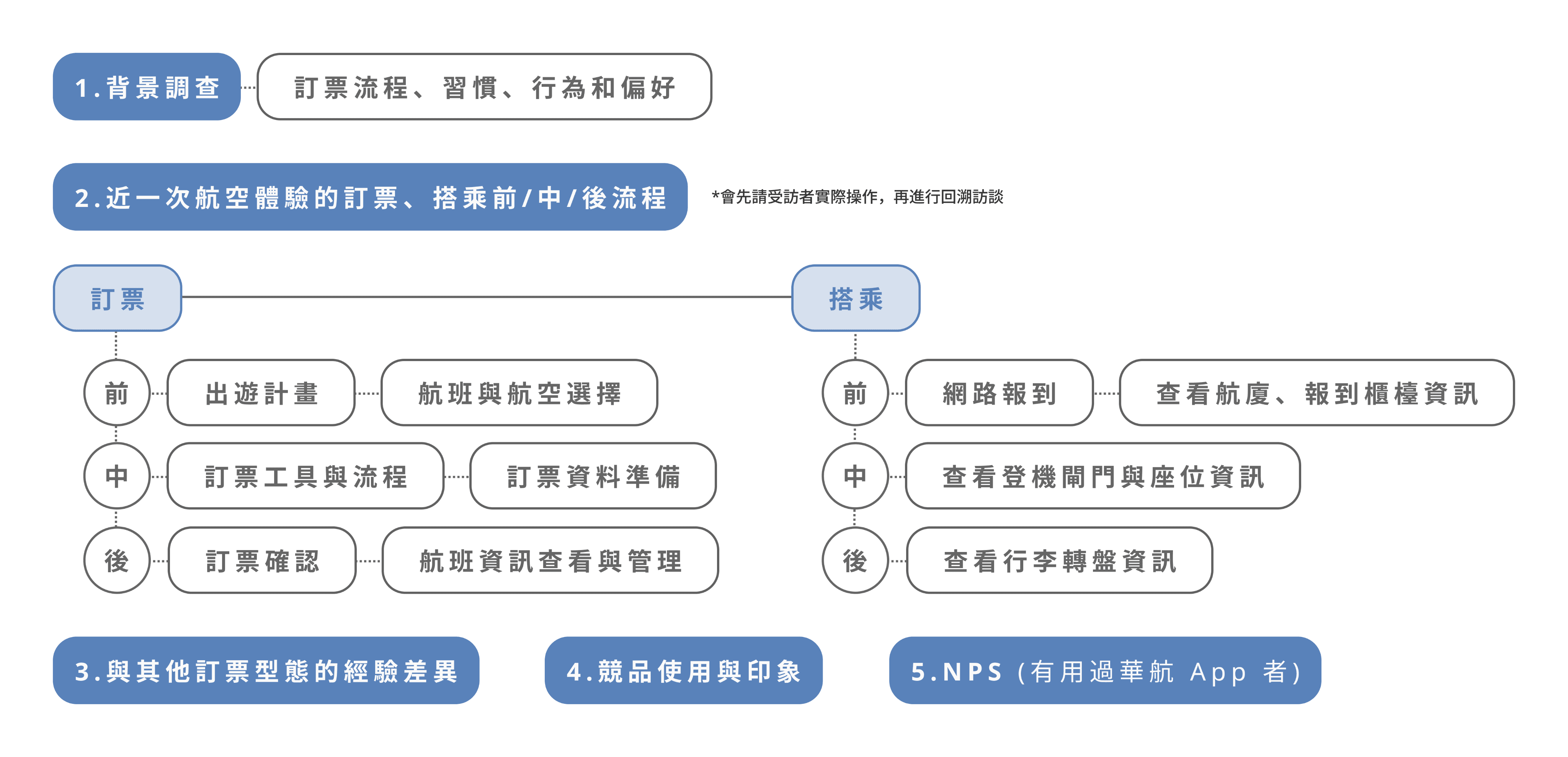 在此基礎上,我們進一步設計訪談大綱,並請受訪者回顧最近一次搭乘航空的完整歷程,以更具體地描述其實際操作與資訊需求。