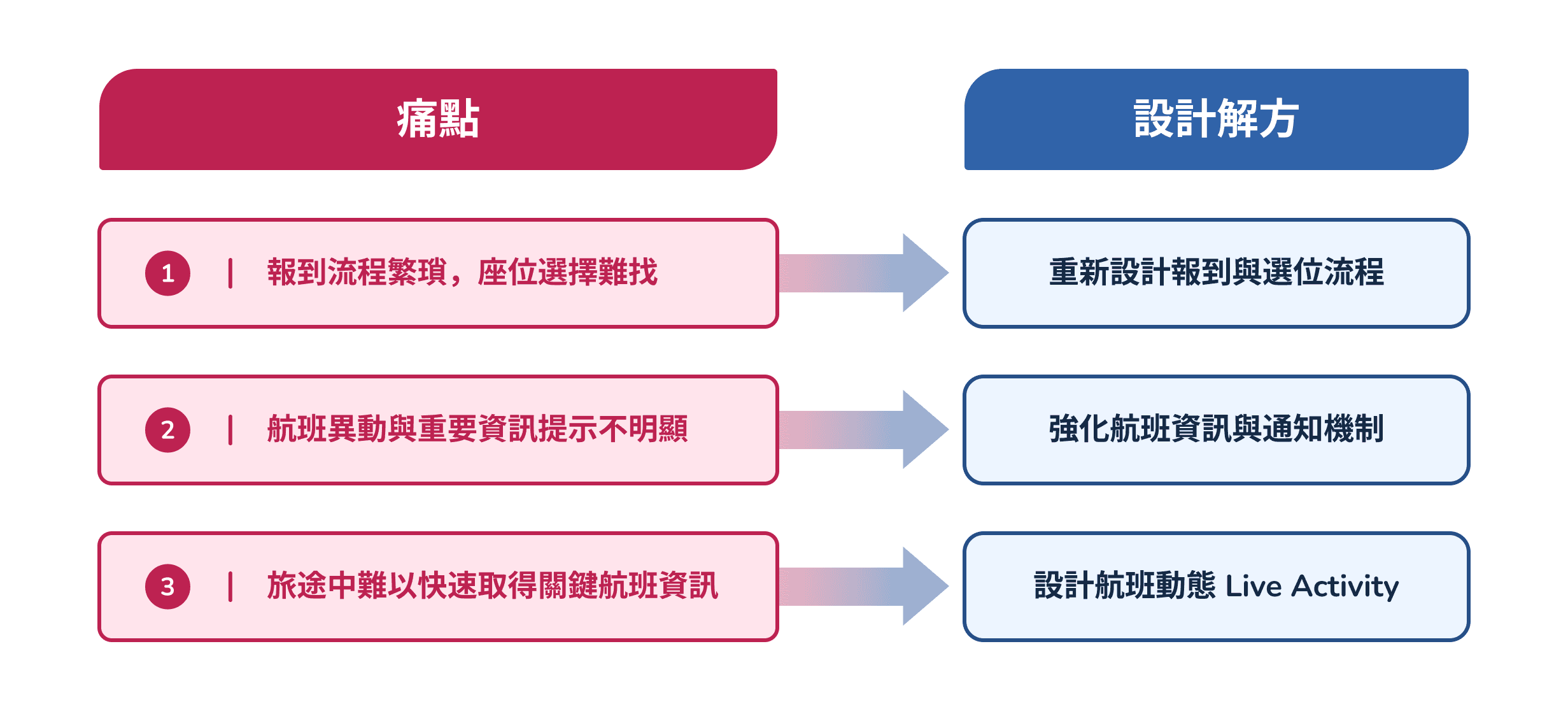 基於這些研究洞察,本次改版聚焦於三個設計方向:優化報到與選位流程、提升航班資訊與通知的可見度,以及 提供即時更新的航班動態資訊 Live Activity。