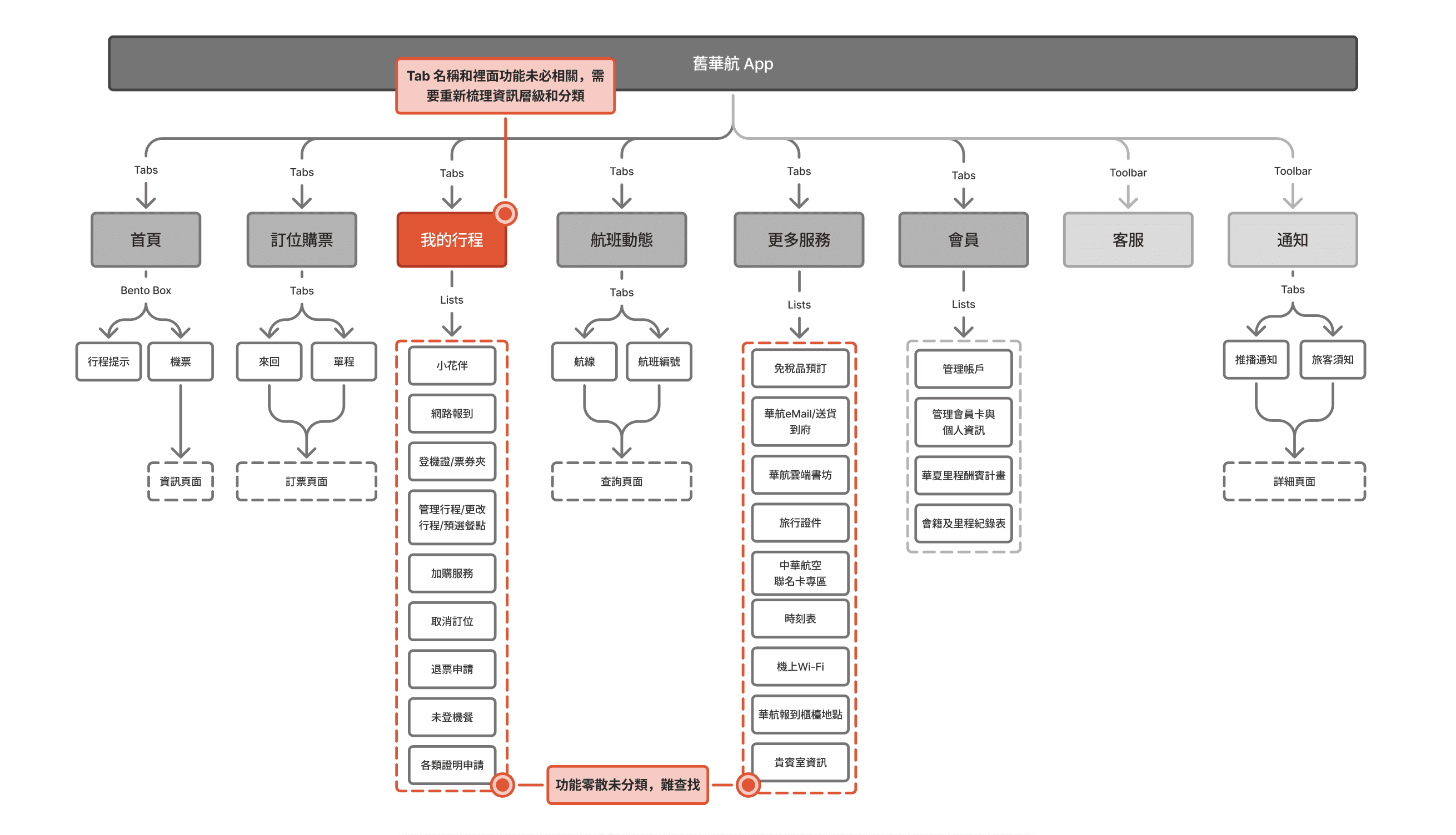 原先華航 App 資訊架構為「首頁」、「訂位購票」、「我的行程」、「航班動態」、「更多服務」5 個 Tab,以及常駐各頁面的「客服」及「通知」。然而,主要 Tab 內的功能與名稱未必相關,以及「更多服務」 Tab 內涵蓋 8 種以上功能,卻未行分類,因此我們認爲需進行資訊架構的重整,下方圖片為舊華航 App 的資訊架構: