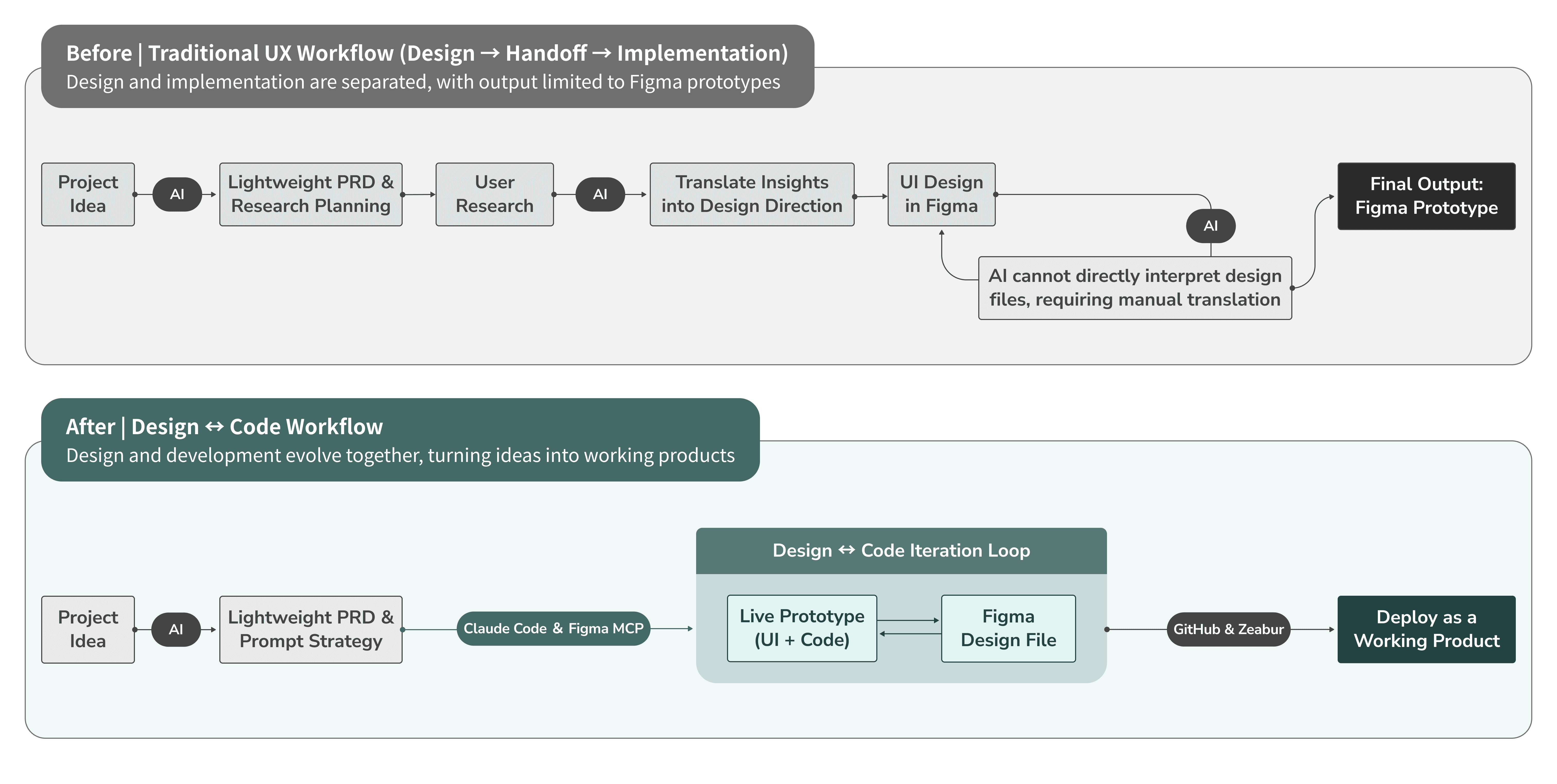 Previously, my design output stopped at Figma prototypes. Even when using ChatGPT, AI mainly supported ideation and discussion, it could not directly interpret or interact with design files. As a result, communication relied on screenshots and text descriptions, and the overall workflow remained linear and disconnected.