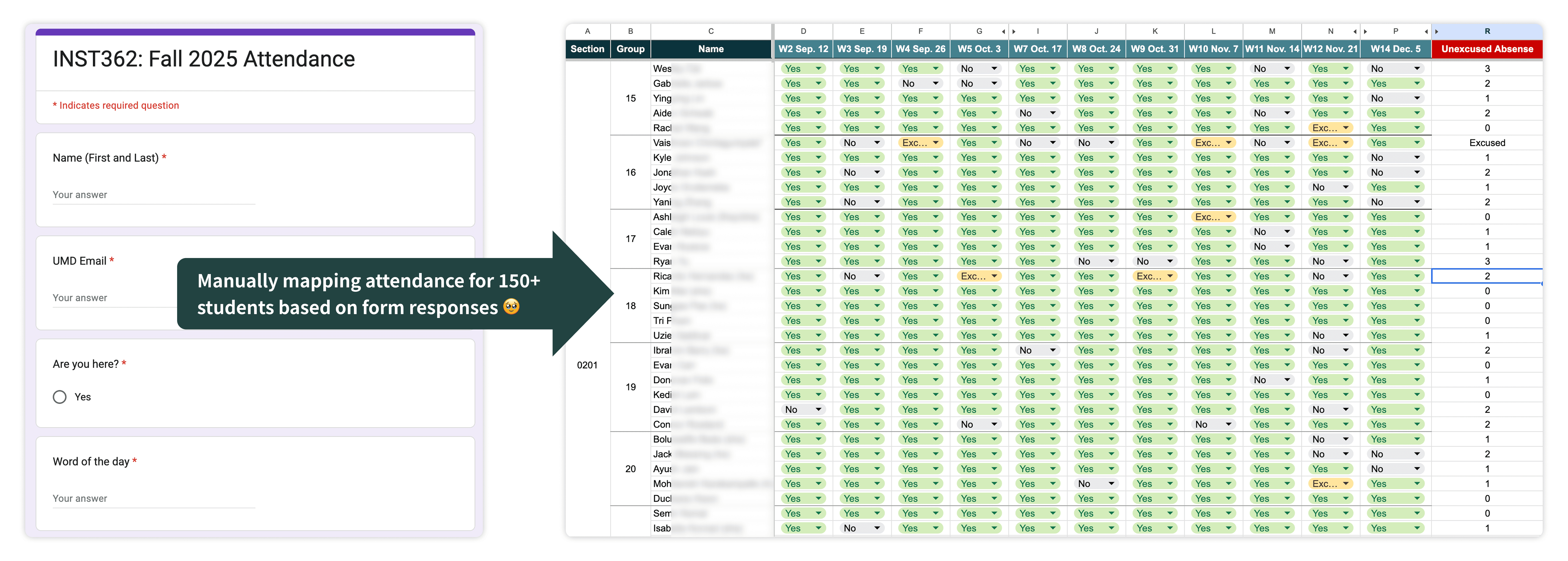 While working as a Teaching Assistant at the University of Maryland, I was responsible for managing attendance for 150+ students, handling absence requests via email, and keeping track of overall attendance status. In practice, these tasks were fragmented across multiple tools—ELMS (a course management system), Google Forms and spreadsheets, and email, requiring significant manual coordination and constant context switching.