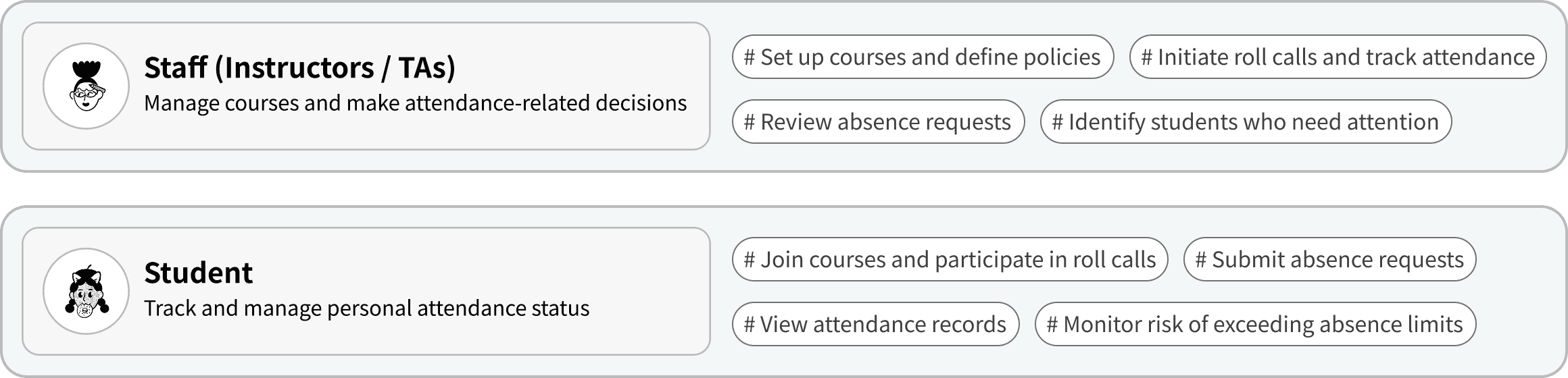 Attendly serves two primary user groups: Staff (Instructors / TAs) and Students, each with distinct responsibilities and interaction patterns within the course.