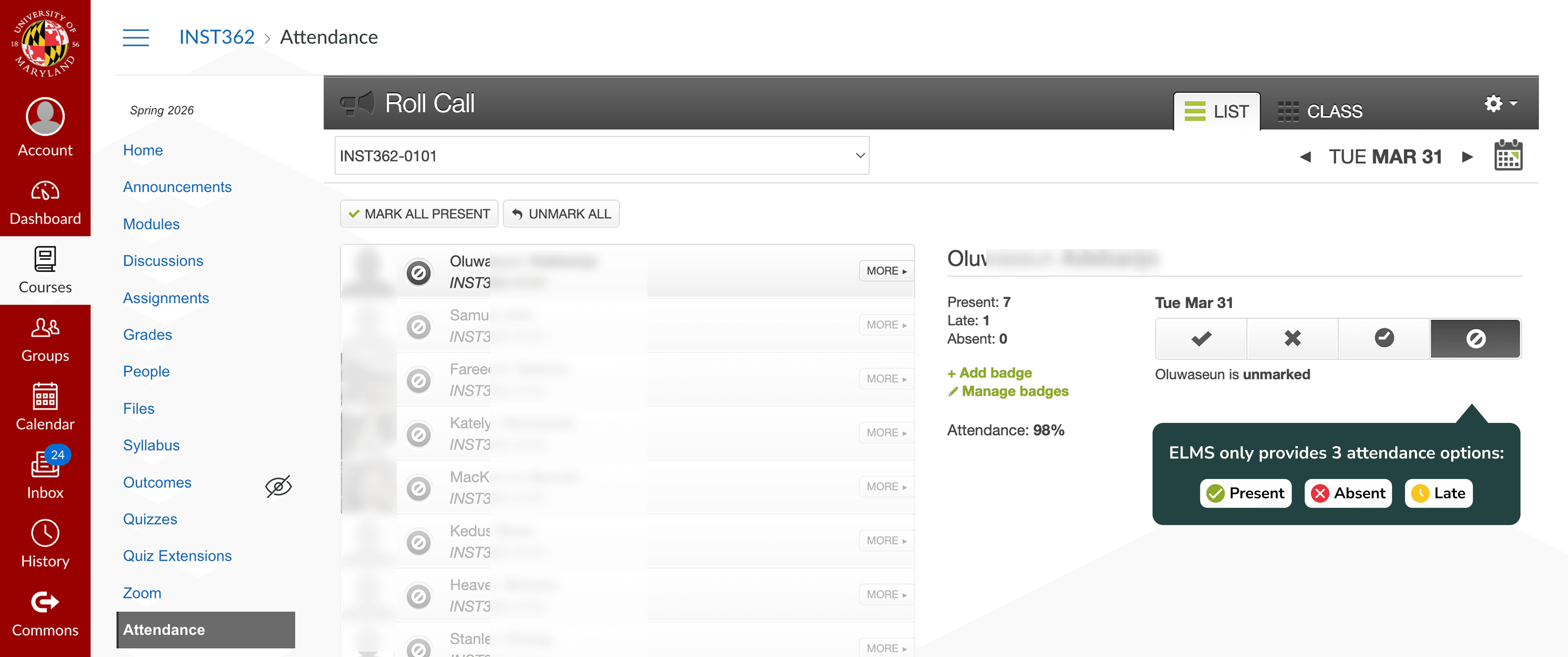 ELMS only supports basic attendance statuses (present, absent, late), with no support for excused absences or group-level tracking.
