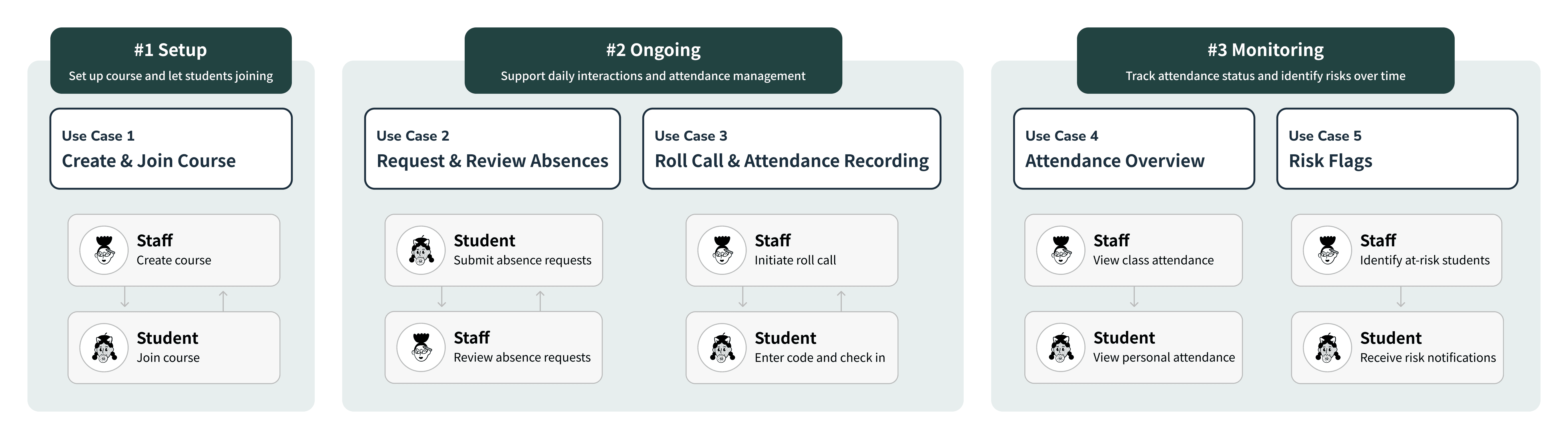 Attendly is structured around three key phases: course setup, ongoing interactions, and attendance monitoring, while supporting both staff and student workflows.