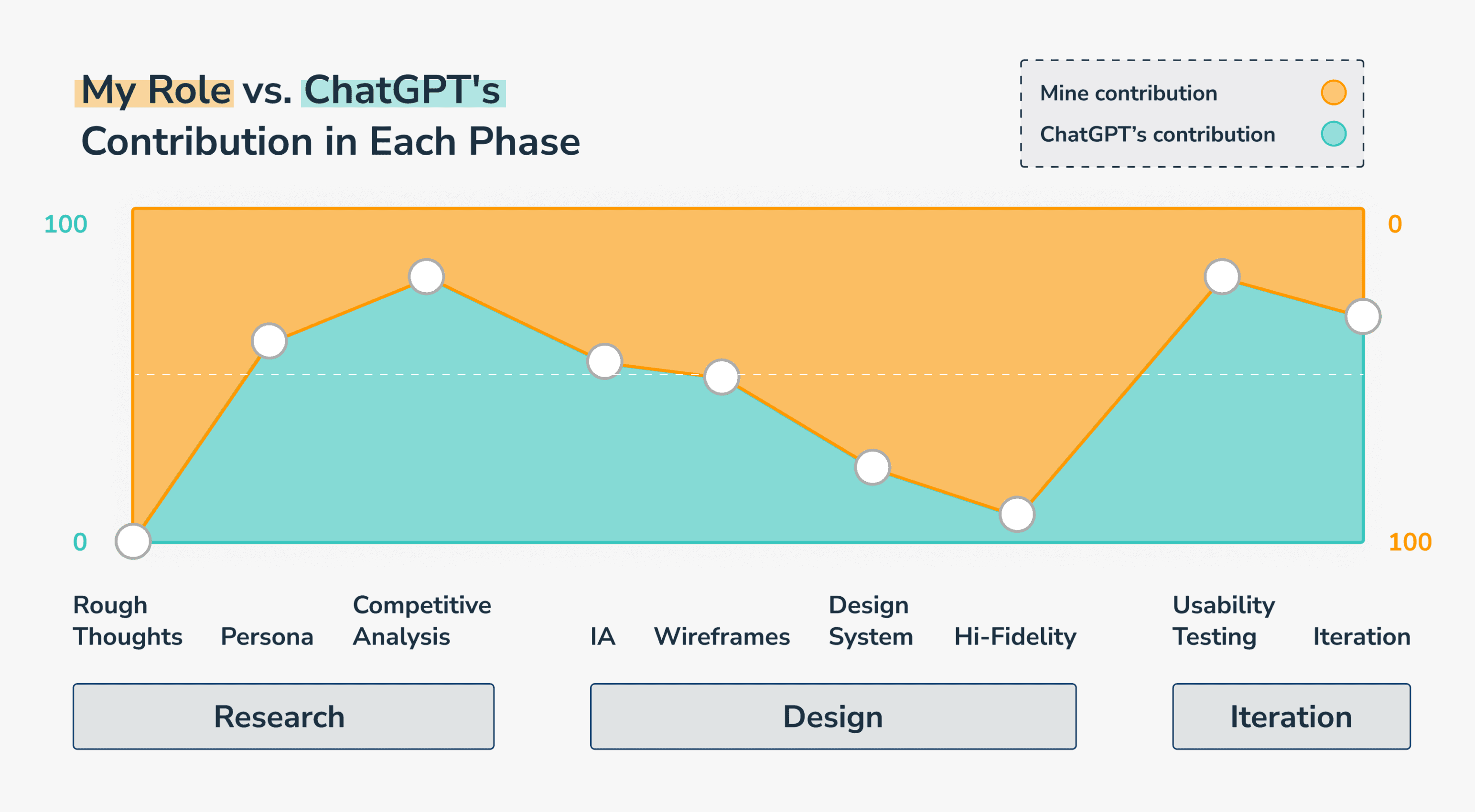 To explore how generative AI could shape each phase of UX work, I tracked how much ChatGPT contributed vs. how much I led throughout the project. As shown in the graph, AI was especially helpful in early-stage research and late-stage iteration, while I took the lead in design execution. This highlights that while AI can assist with ideation and refinement, designers remain irreplaceable when it comes to creativity, empathy, and context-driven decisions.