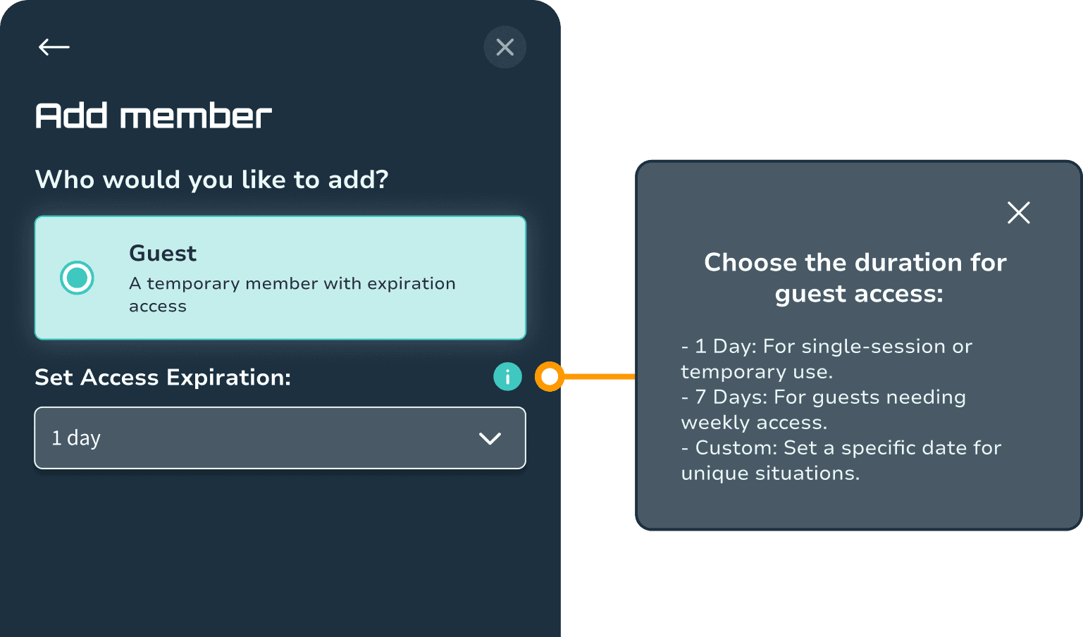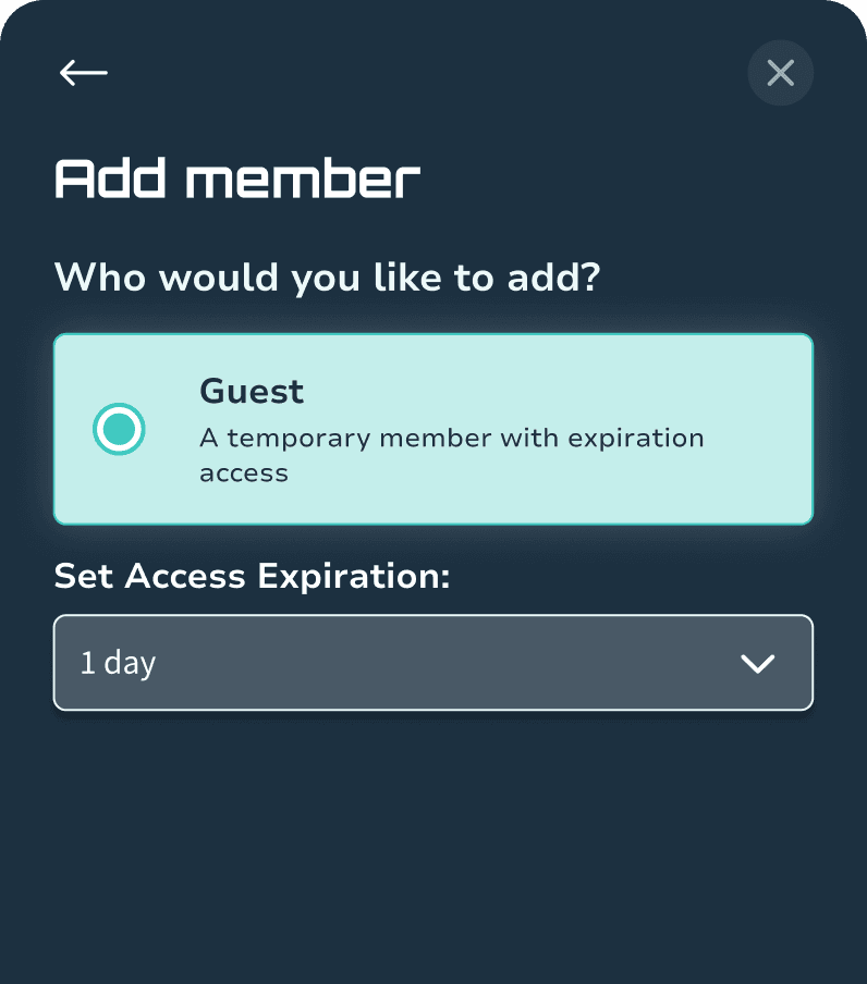 Owners can grant temporary access by setting an expiration date and sharing a secure QR code. Guests can join the account directly via a web link, eliminating the need to download the app.