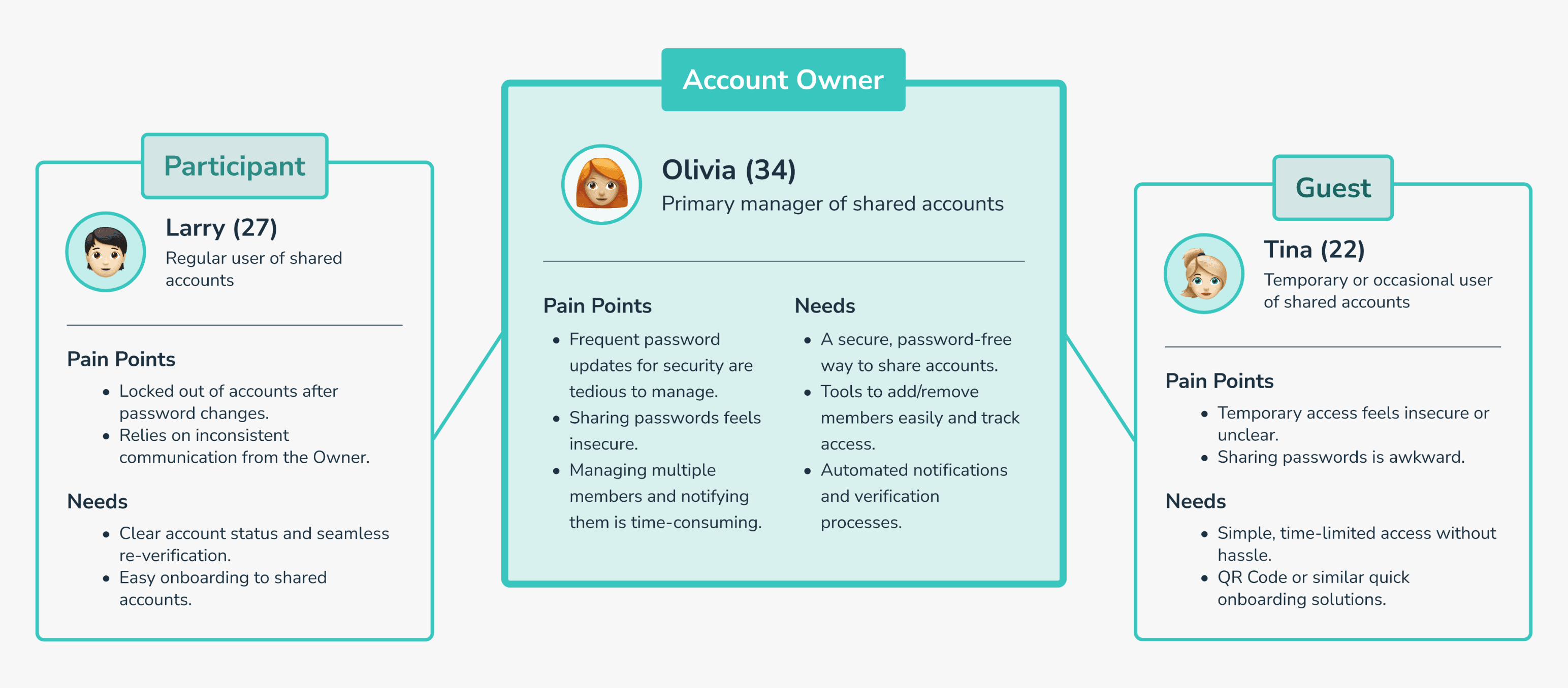 I segmented users into three roles—Account Owner, Participant, and Guest—helped surface distinct needs and frictions around shared access. While Participants and Guests often face access or clarity issues, Account Owners bear the cognitive load of managing and securing multiple users. This led me to focus on Owners as the primary design driver—designing tools that would not only help them, but indirectly improve the experience for everyone in the sharing circle.