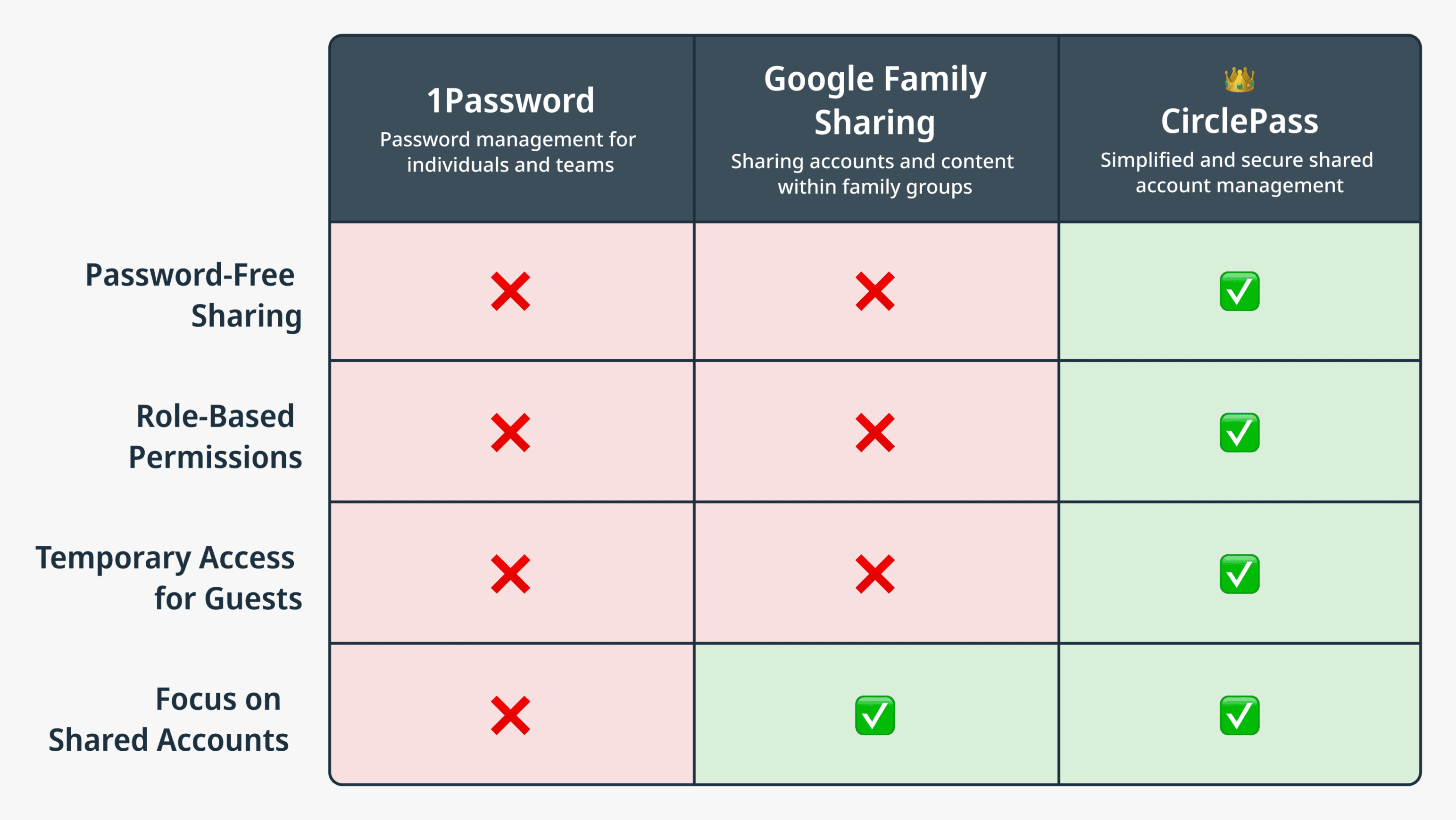 Designed with roles and access logic built-in, CirclePass eliminates password fatigue and awkward workarounds—making shared usage smoother, safer, and more respectful of different access needs. The table below shows how CirclePass compares to these existing tools based on four key criteria.