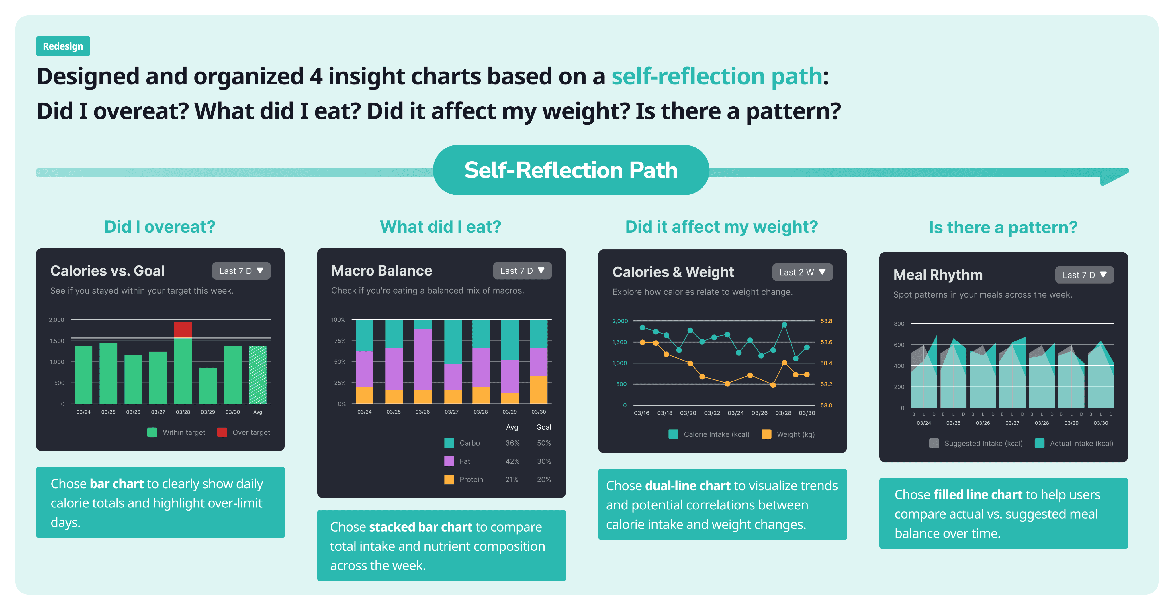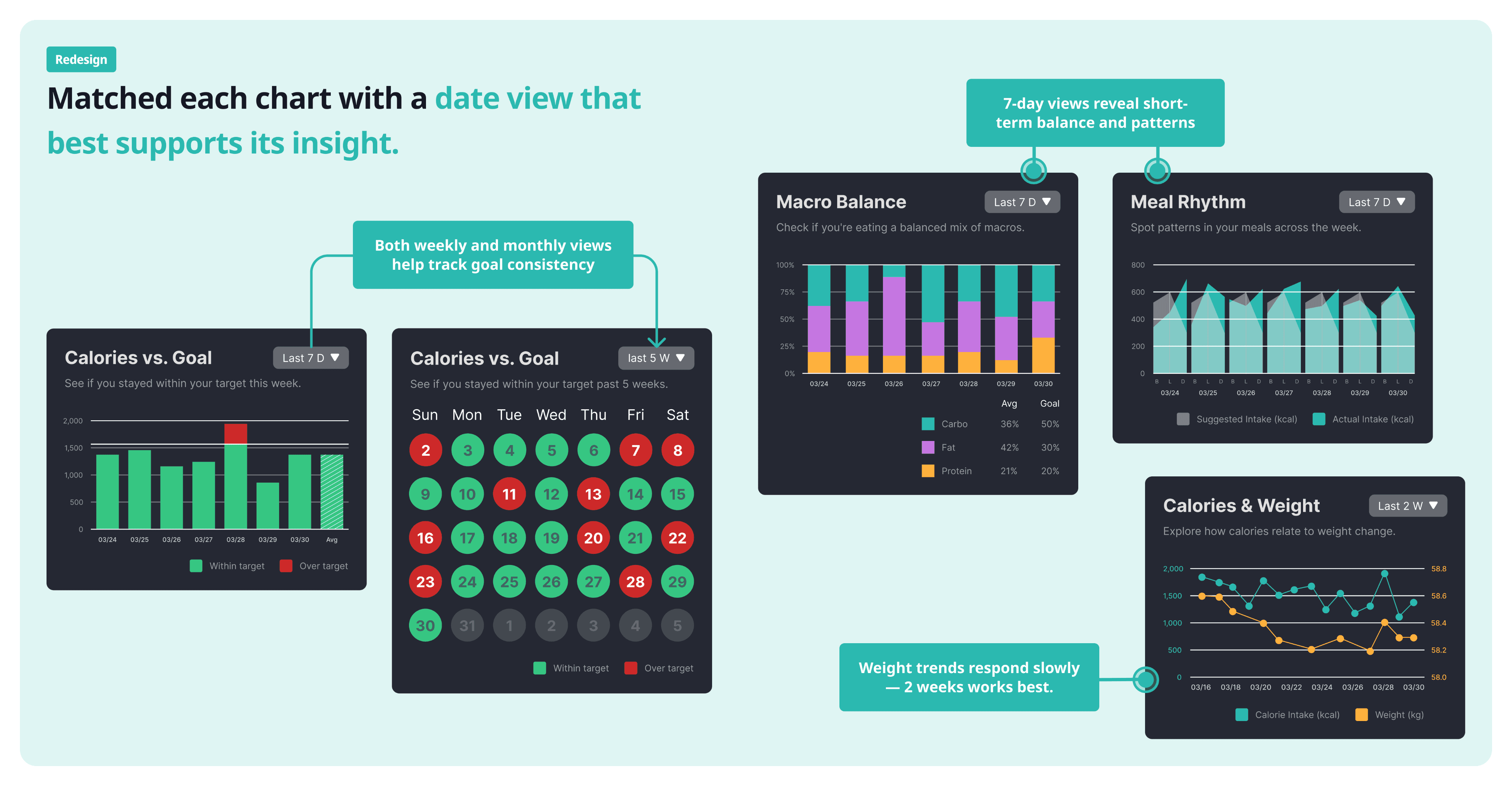 Beyond visualization type, I also matched each chart with a date view that best supports its insight. Short-term charts like Macro Balance and Meal Rhythm use a 7-day view to reveal daily balance and patterns, while longer-term charts like Calories vs. Goal and Calories & Weight include weekly or bi-weekly views to highlight consistency and gradual trends. This flexibility makes reflection more contextual and meaningful.