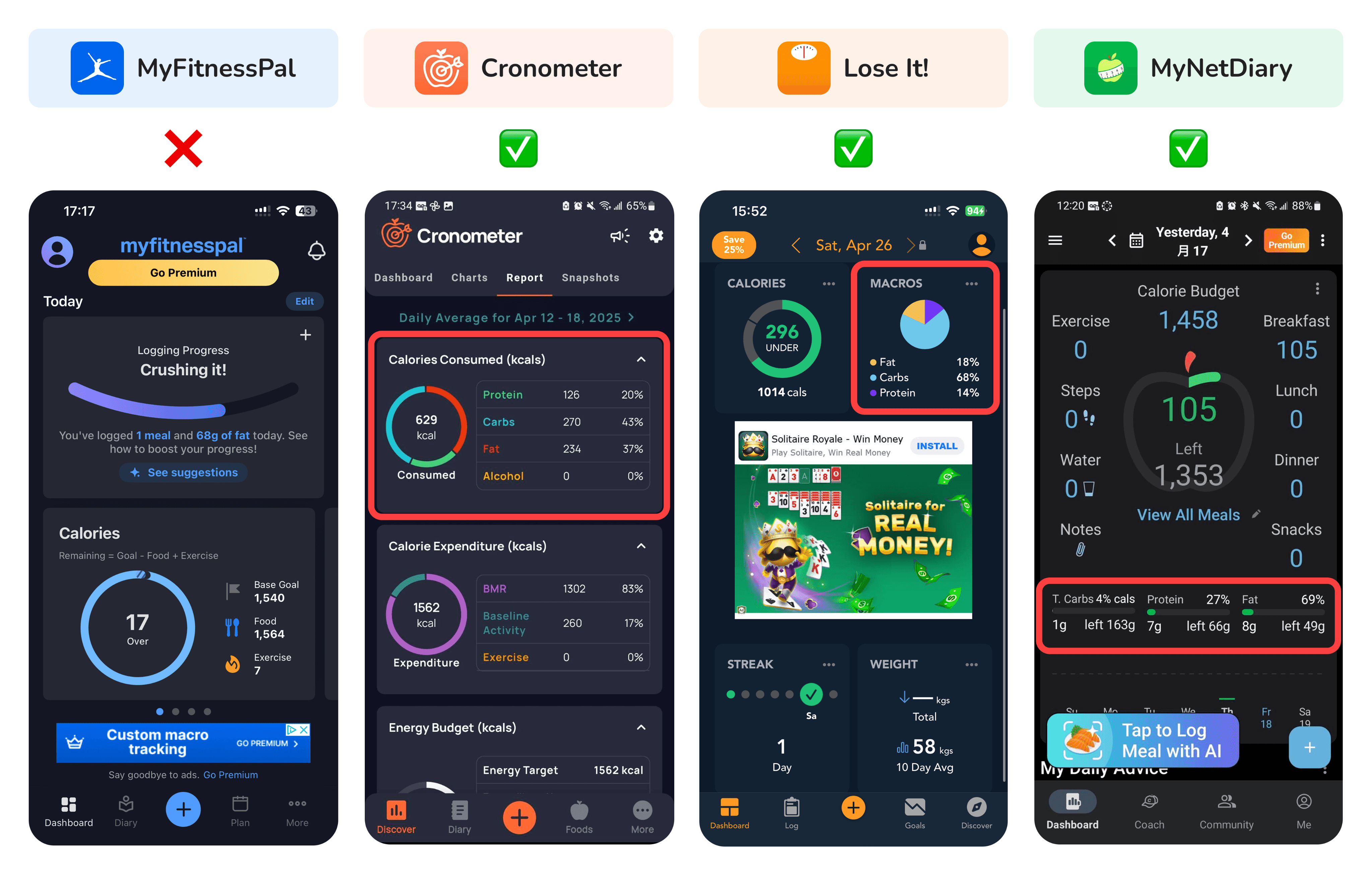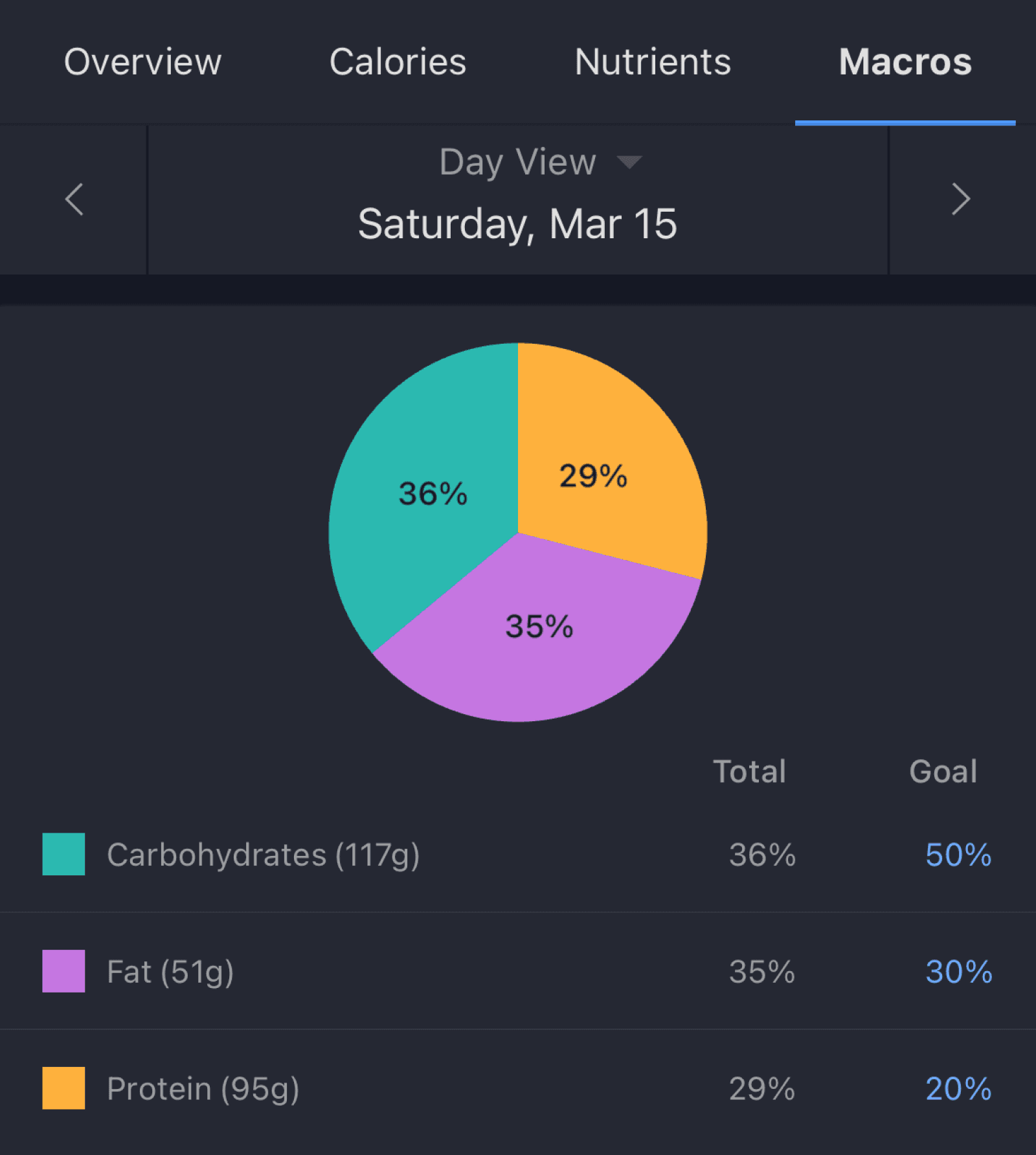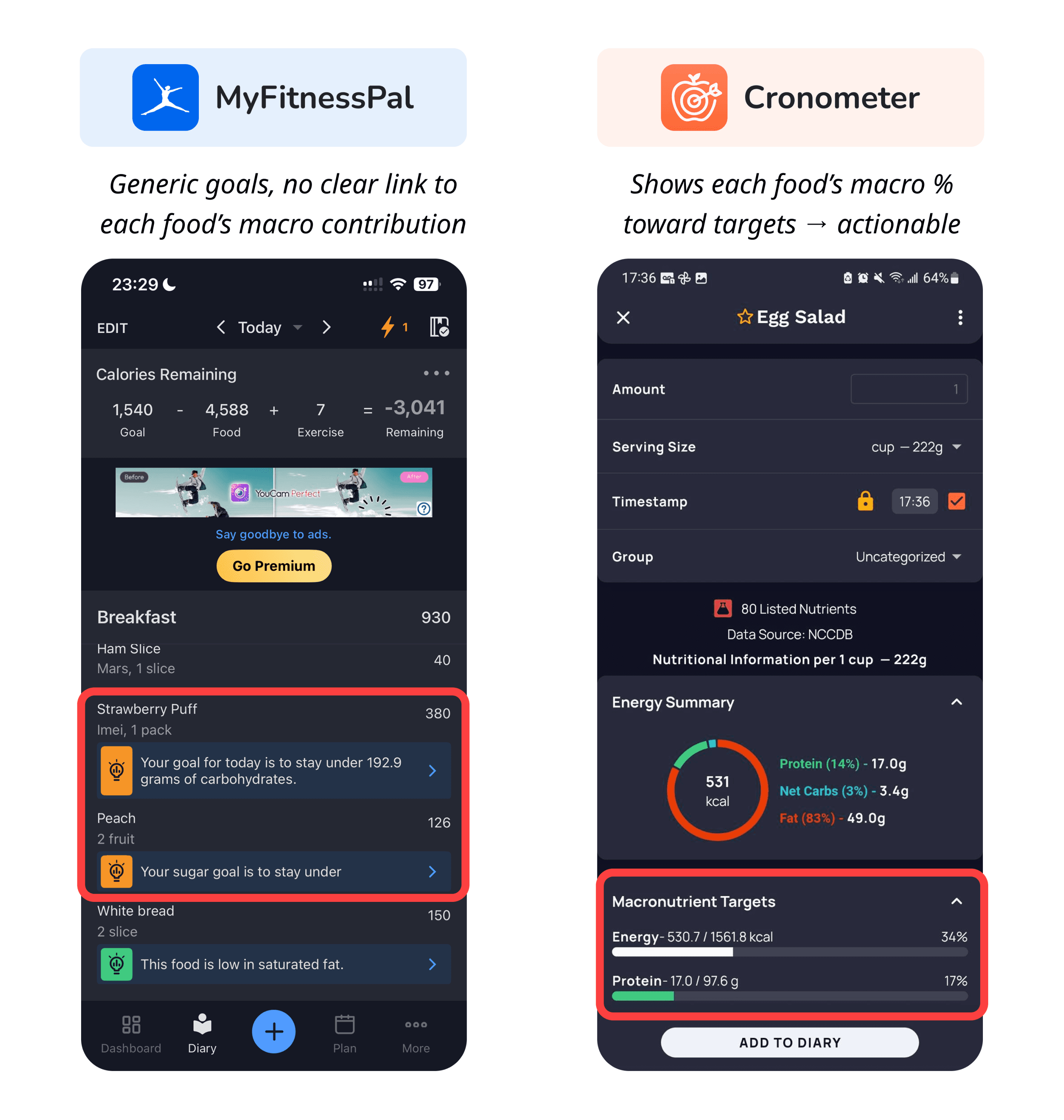 Cronometer, on the other hand, breaks down each food’s macronutrient contribution relative to the user’s goals. By visualizing percentages and highlighting imbalances, it enables users to reflect and take concrete next steps.