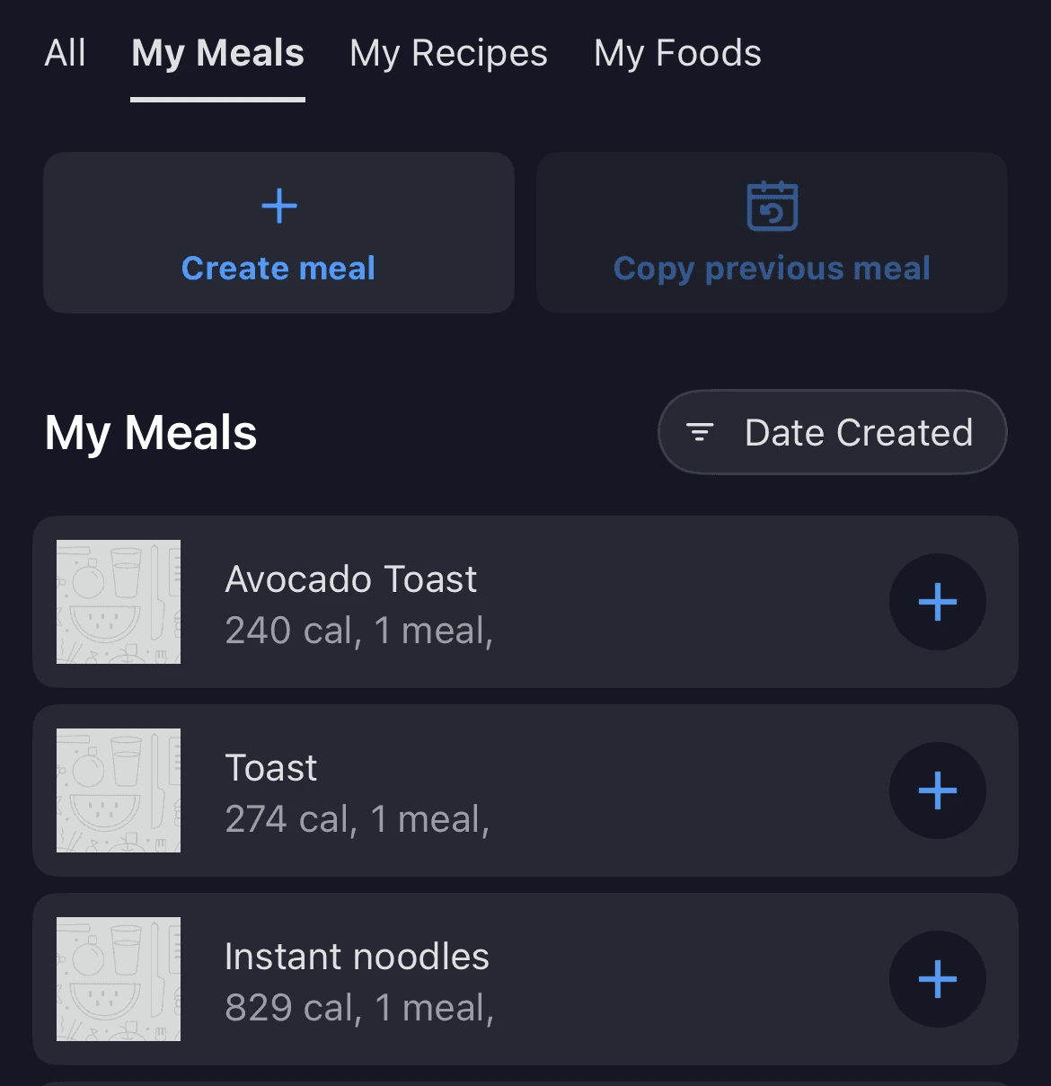 Shortcuts (Copy Previous Meal / My Meals) reduce repeat input.