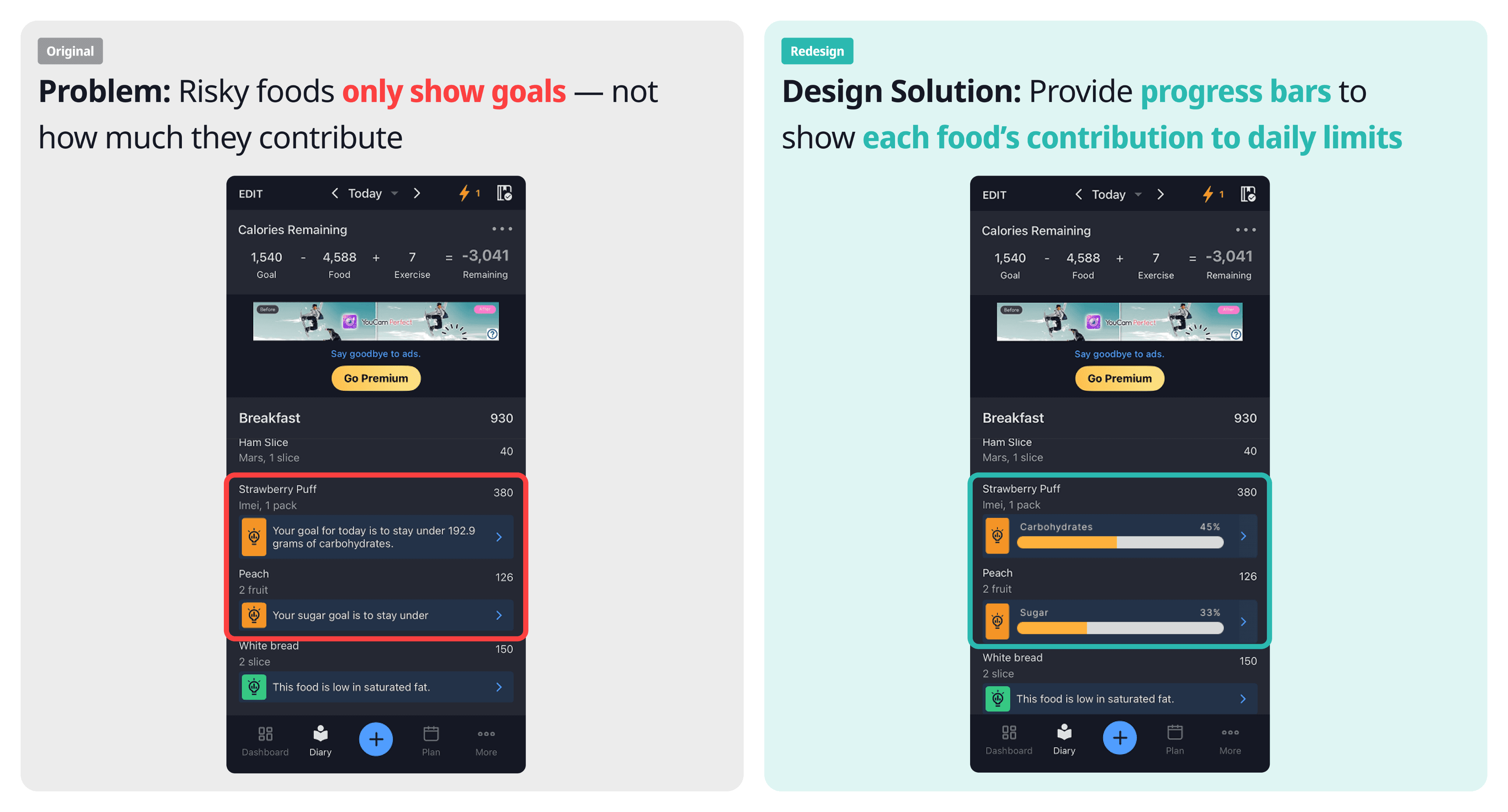 MyFitnessPal already alerts users when certain nutrients exceed limits, but the feedback is text-heavy and unclear — users know what is wrong, but not why. I redesigned the feedback system to visualize each food’s contribution through progress bars, highlighting nutrients nearing limits while keeping low-risk foods subtle. This makes the alerts more intuitive and actionable.