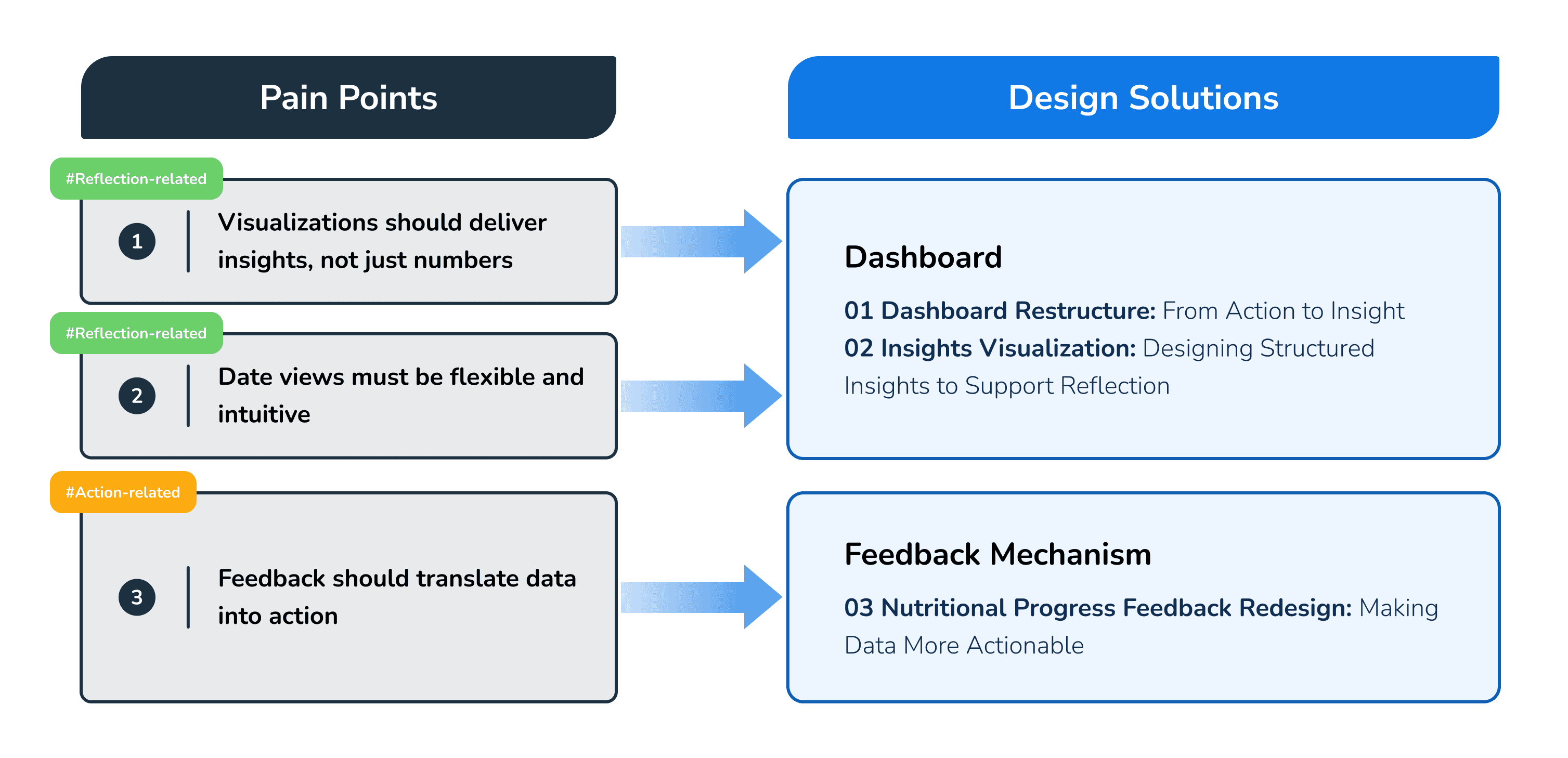 Based on the analysis, I identified three recurring pain points around insight delivery, flexibility, and feedback. These were grouped into two focus areas — Dashboard Redesign to improve reflection and Feedback Mechanism Redesign to make feedback more actionable.