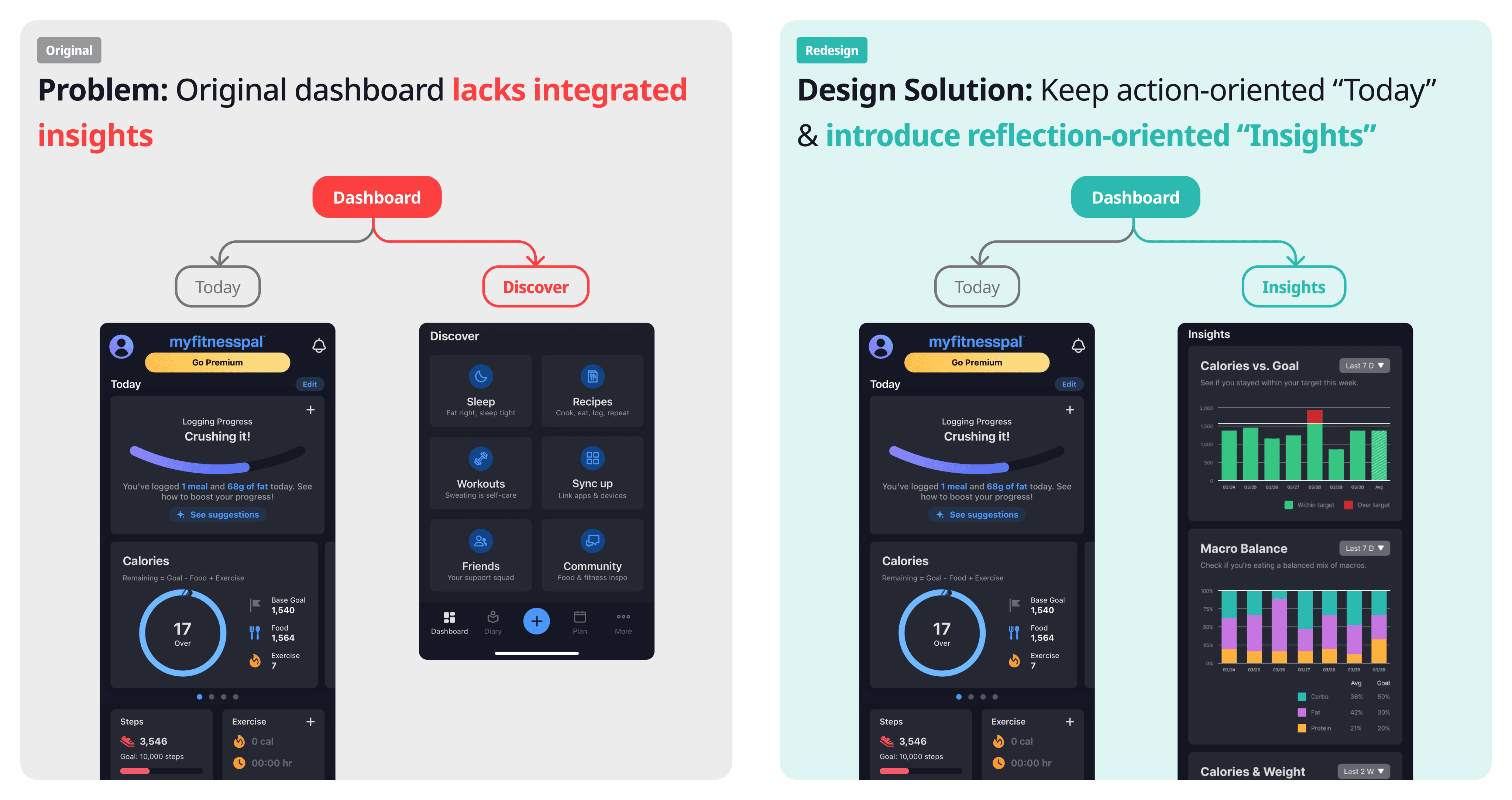 A research-driven redesign that helps MyFitnessPal move beyond logging to support real reflection and action.
