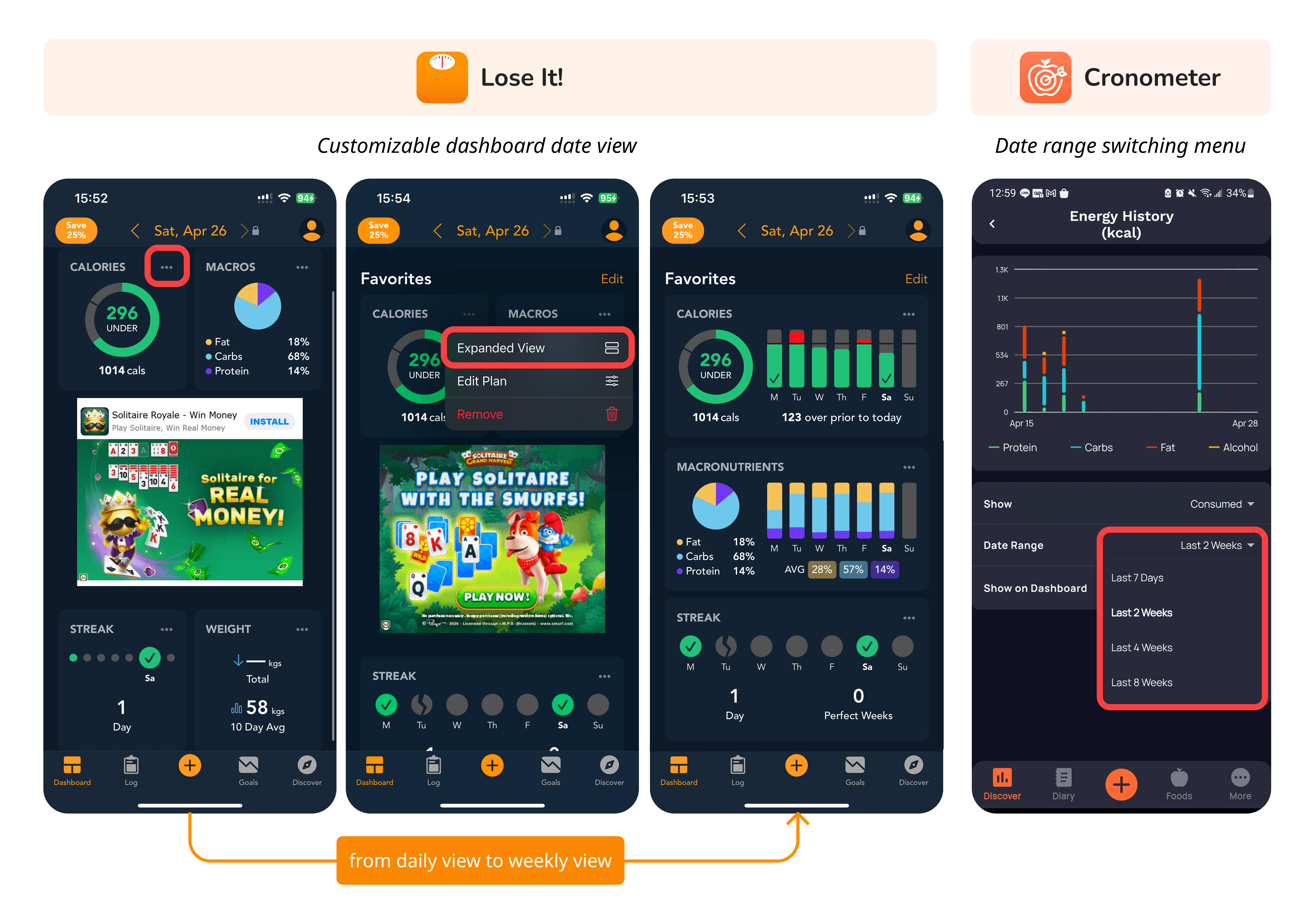 Lose It!: Allows switching from daily to weekly views directly on the dashboard.