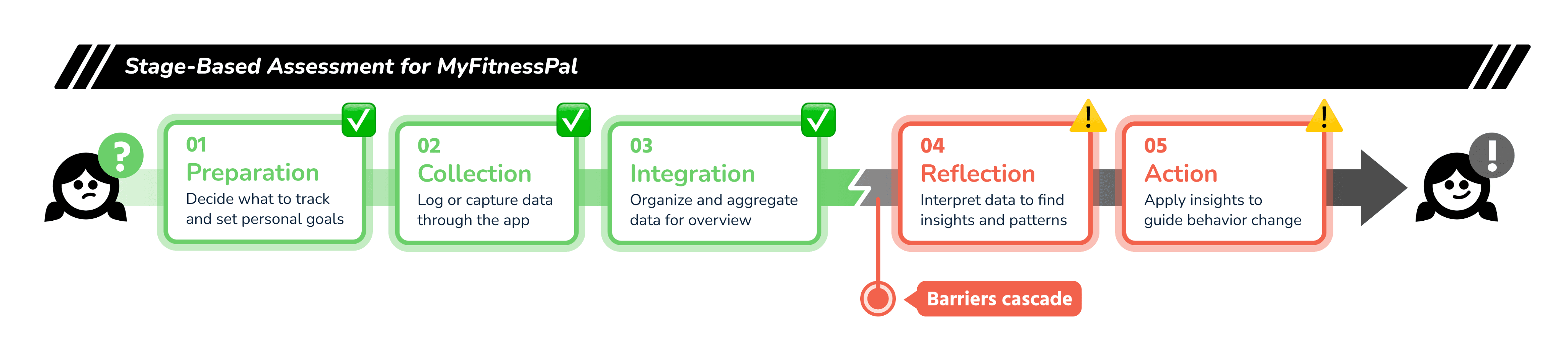 Our evaluation using the Stage-Based Model shows that MyFitnessPal performs strongly in the early stages—Preparation, Collection, and Integration—but provides limited support for Reflection and Action, where users need insights and guidance to change behavior.